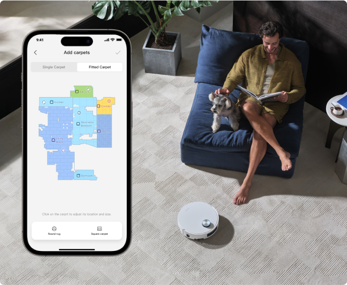 *Funksjonen anbefales ikke for tepper som overstiger en høyde på 3 cm, da høyere tepper kan risikere å bli fuktige. Innstillingene for tepperengjøring av mellomtykke og tynne tepper må aktiveres manuelt via rengjøringsappen.