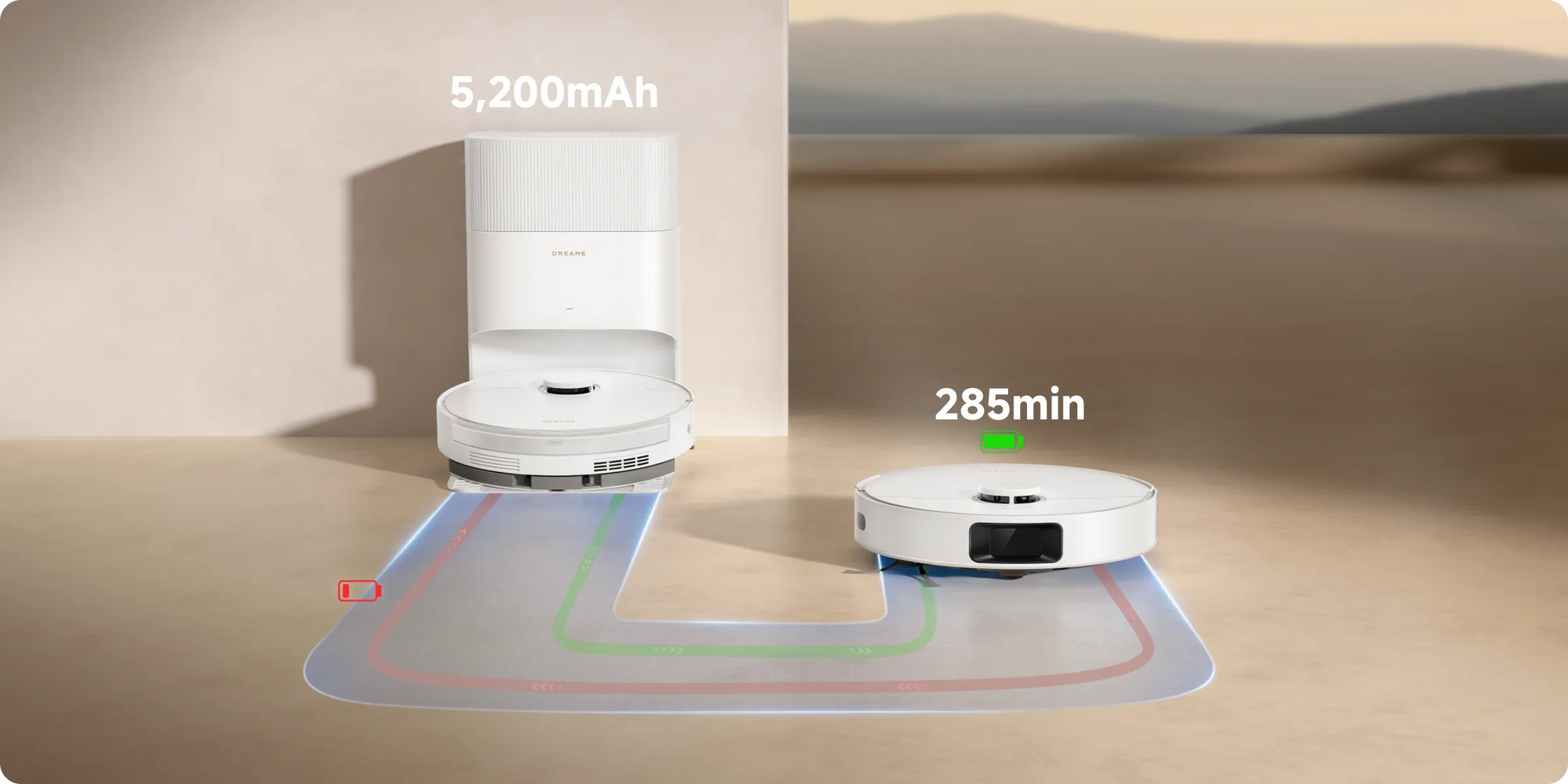 *285 min: Basert på våre interne laboratoriedata under støvsuging- og moppingsmodus. Faktisk ytelse kan variere.