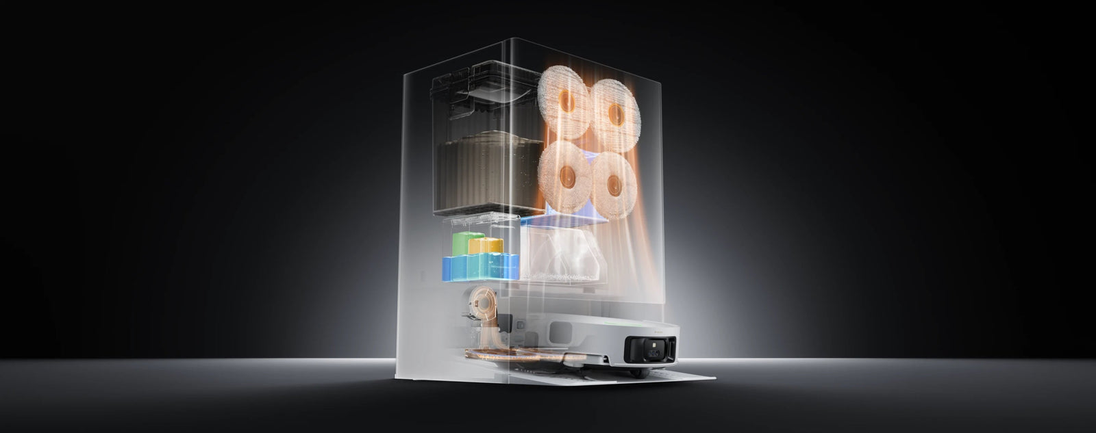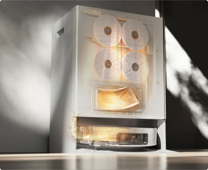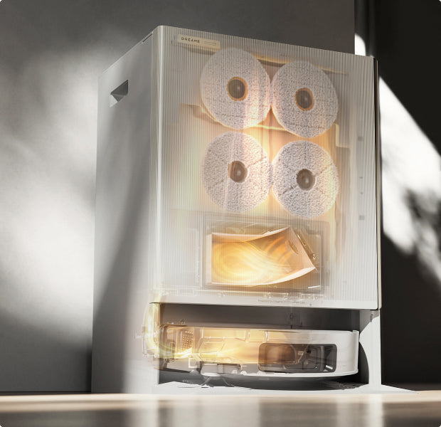 DashDry™-system: Etter rengjøring vil den først tørke moppene og deretter tørke støvposen og støvboksen.