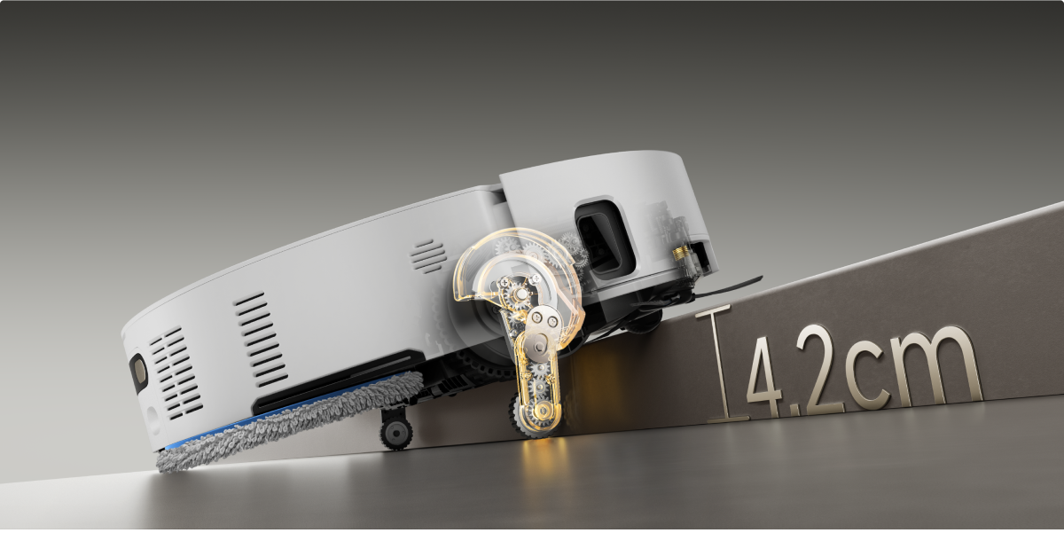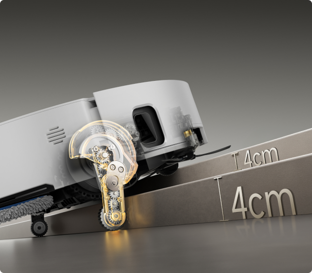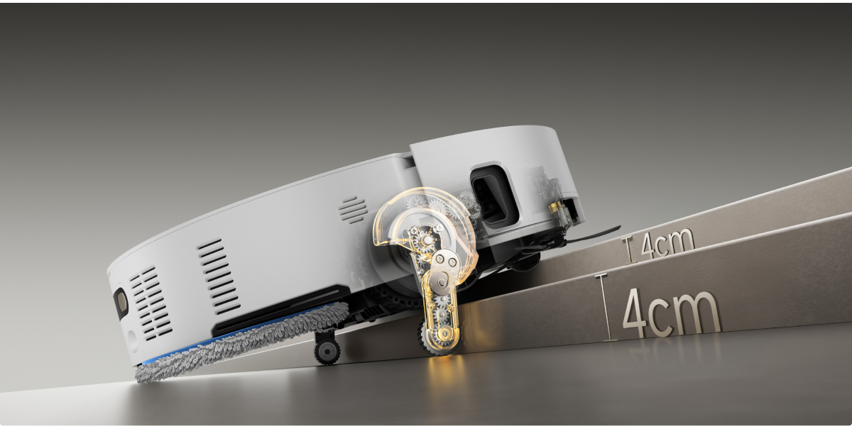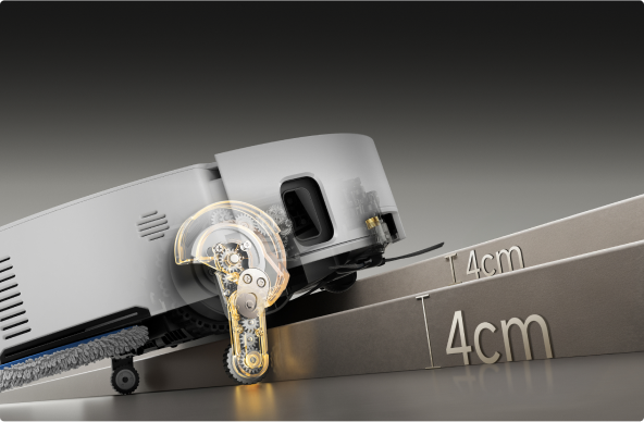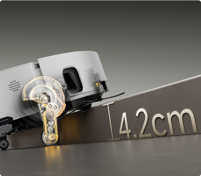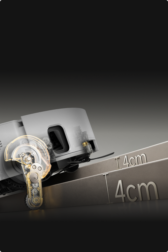*8 cm, 4 cm: Refererer til trinn med doble lag der toppflaten på det nedre trinnet er over 12 cm bred, når robotstøvsugeren bruker de uttrekkbare bena i hekkestil-modus. For trinn med ett lag er den høyeste høyden 4,2 cm. Basert på våre interne laboratoriedata. Faktisk ytelse kan variere.