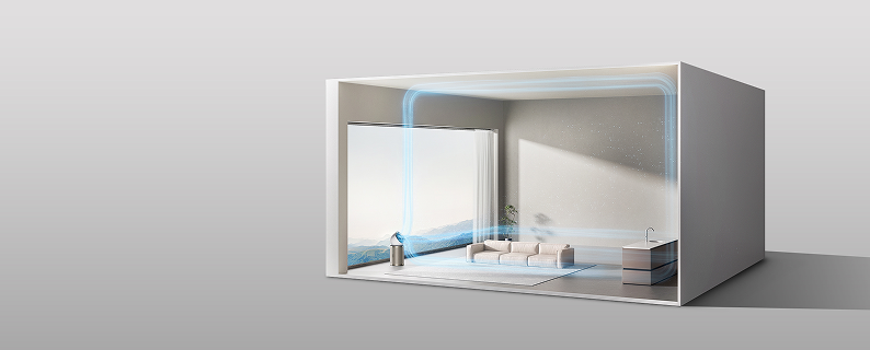 Designet med en ultralang luftstrøm fremover fordeler ren luft jevnt i hele rommet. Luftrenseren gir forbedret luftsirkulasjon med jet-teknologi, og når opptil 10 m* innenfor et område på 100 ㎡*.