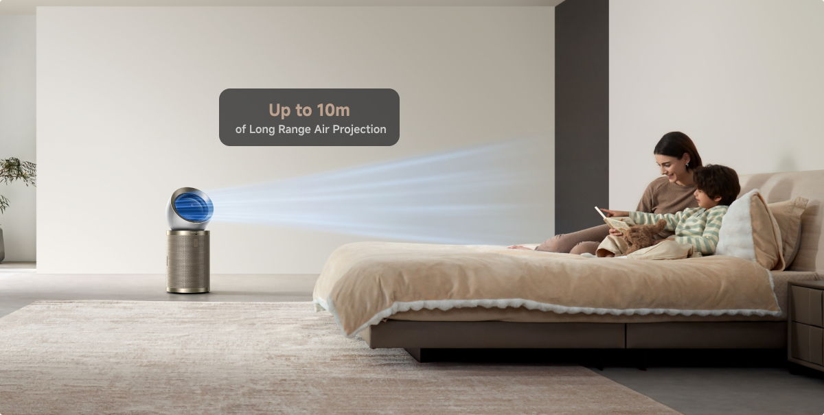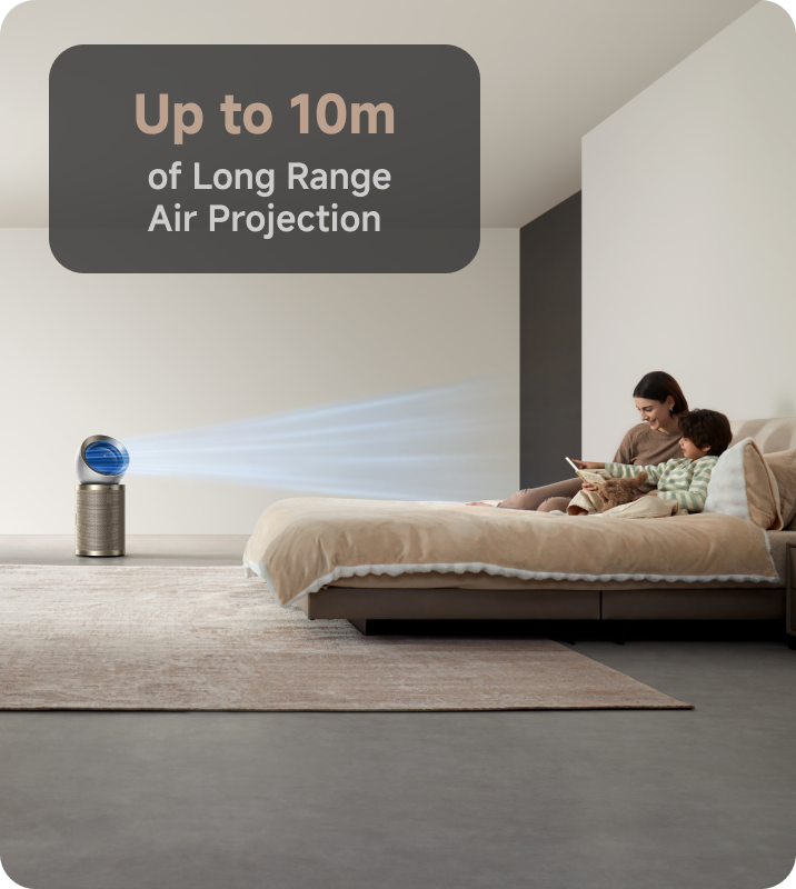 Designet med en ultralang luftstrøm fremover fordeler ren luft jevnt i hele rommet. Luftrenseren gir forbedret luftsirkulasjon med jet-teknologi, og når opptil 10 m* innenfor et område på 100 ㎡*.