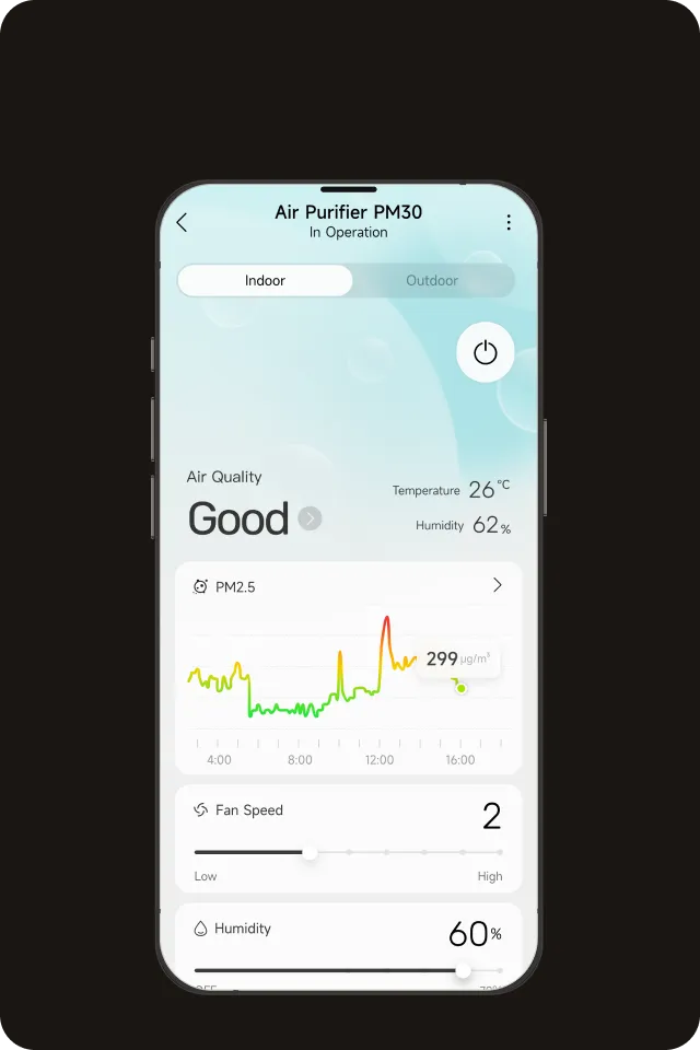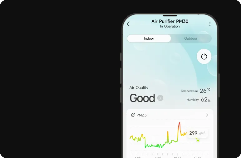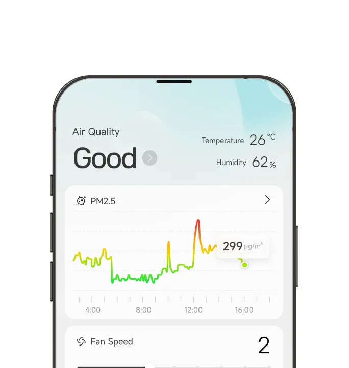 *15 minutter, 100 m³: I henhold til GB/T 18801-2022, gjør enhetens 400 m³/t CADR det mulig å rense et rom på 100 m³ på ca. 15 minutter. Faktisk ytelse kan variere.